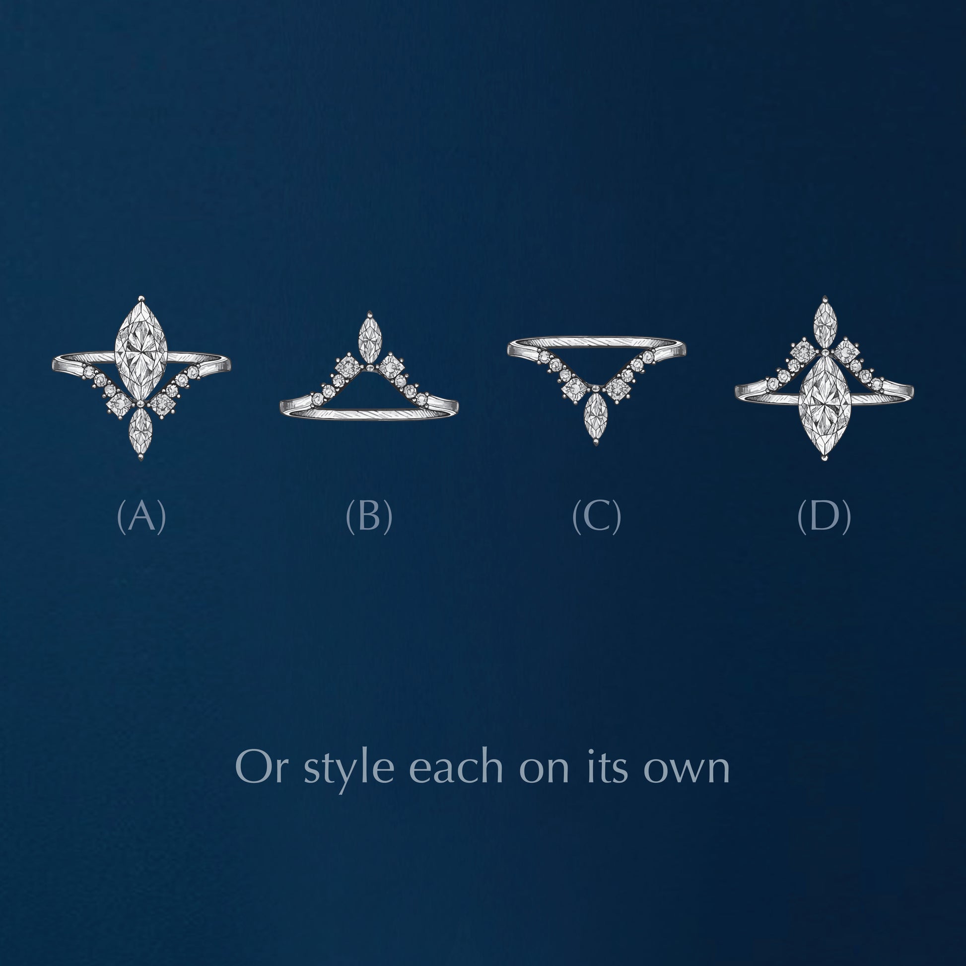 The Marquise ring, effortless, luminous, unforgettable designed to wear together or apart crafted in white gold and lab diamond for effortless versatility